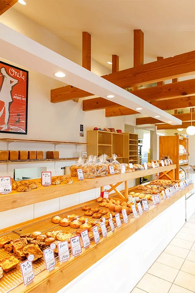 店内は明るく開放的な雰囲気です。惣菜系やスイーツ系のパンが充実しており、乳・卵 不使用のパンもあります。子どもから大人まで、アレルギーの家族も一緒においしいパンを味わえるのが魅力です。